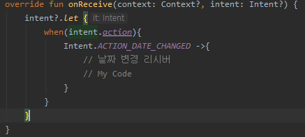 위와 같이 overide된 fun 에서 Intent를 가져와 action을 뽑고, 그 action 값이 DATE_CHANGED 인지 확인하여 이벤트 분기를 치는 것이 제일 좋다.