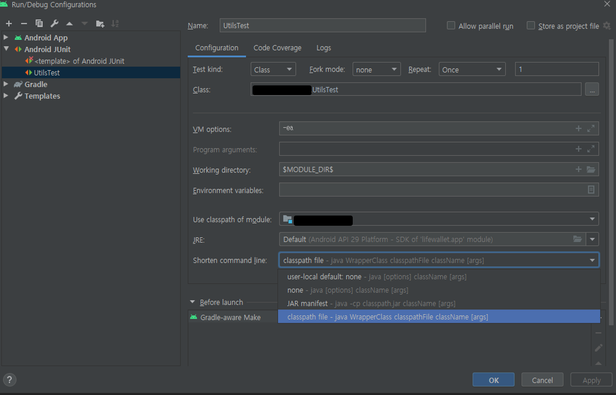 이경우에는 configurations 에 들어가서 아래와 같은 설정을 해야한다.