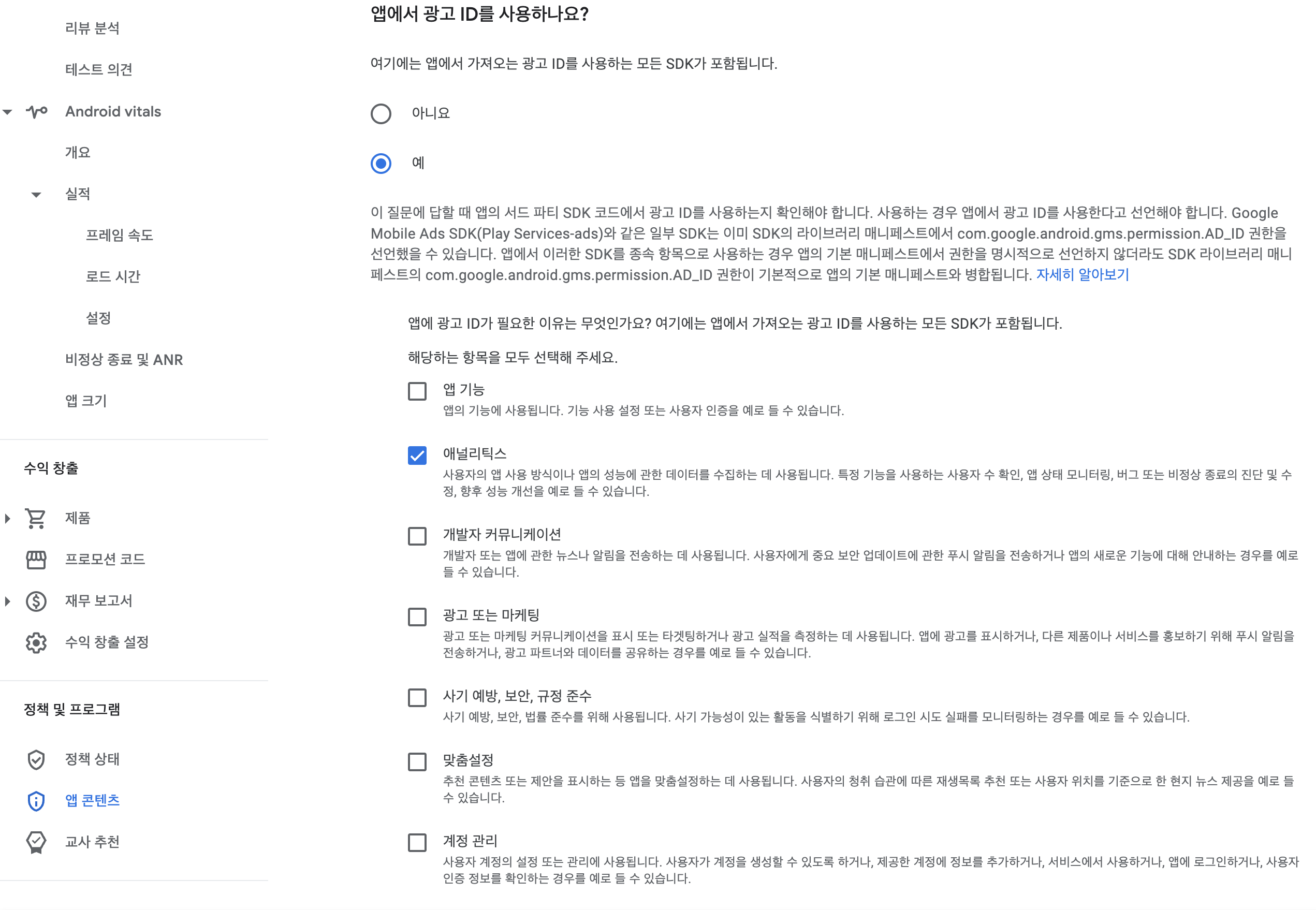 앱에서 광고 ID를 사용한다고 정책을 변경하고, 애널리틱스를 체크해주면 된다.
