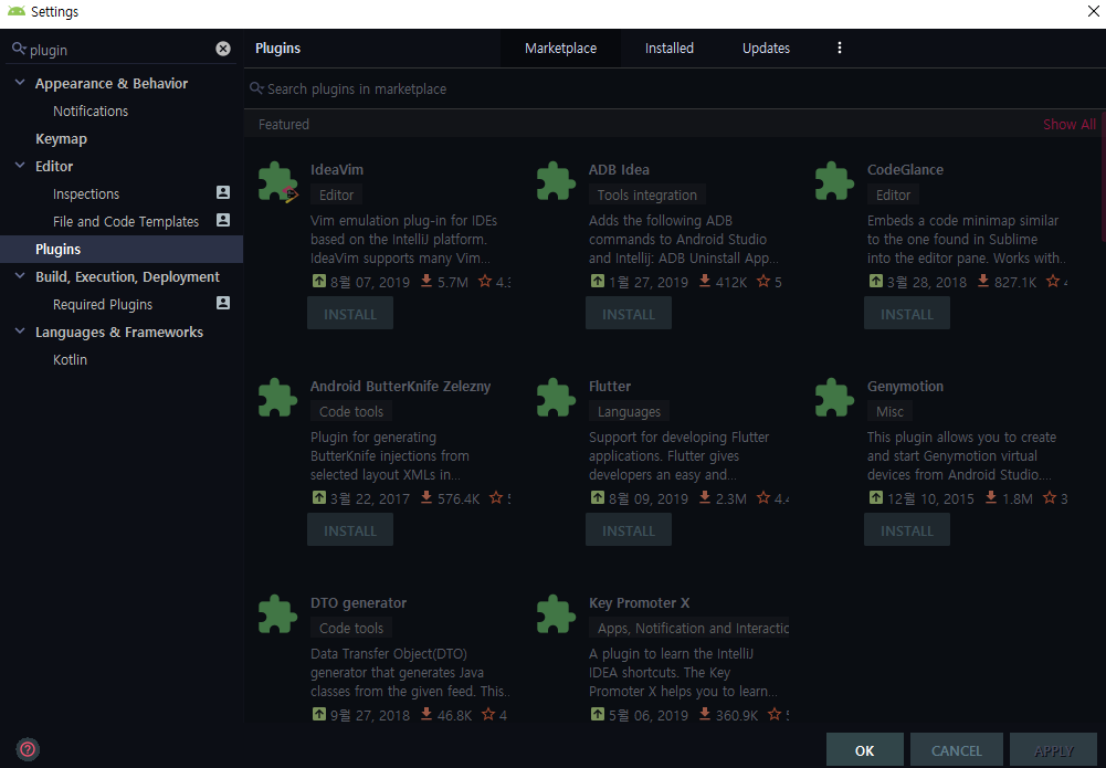 우선 안드로이드 스튜디오를 실행하고 [ File ] -> [ Setting ] 메뉴를 실행하여 검색창에 plugin을 입력한다.